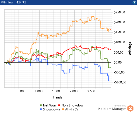 Вообщем последние 2-3 дня игра разладилась. Всё по классике вообщем, недодача, потом неоптимальная игра, потом тильт, ну вы знаете. Профит в минусе сейчас, сколько говорить не хочу, надеюсь отмажусь до конца месяца, выложу график, если нет рейкбек частично спасет банкролл и будем продолжать побеждать покер.