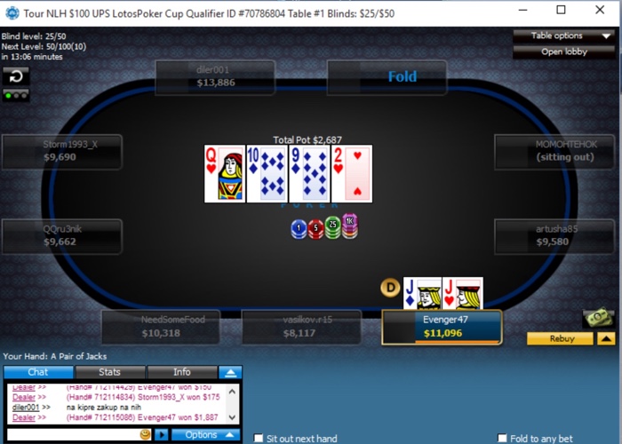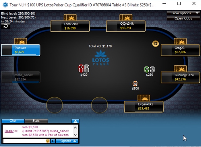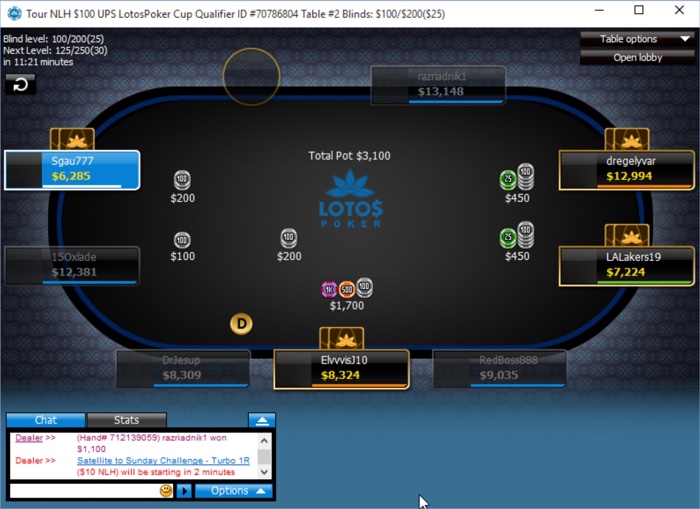 За столами немало сильных игроков, постоянных участников UPS и неоднократных победителей сателлитов на LotosPoker. Один из лидеров после двух перых уровней - Александр "ElvvvisJ10" Пригарный, Антон "Sgau777" Смирнов, "diler001" и ваш покорный слуга, на которого снизошло: KK, QQ, JJ, AKs и т.д.