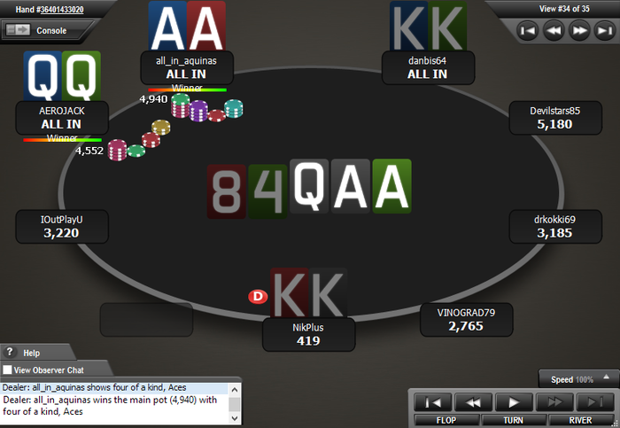 Результат: Опп закрыл пуш на А9о ривером пришел туз. А9 устояли.