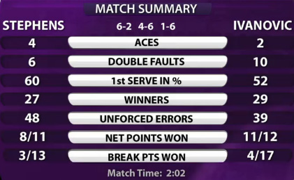 - Иванович-Стивенс 2-6, 6-4, 6-1. Иванович неслучайно занимает место в топ-10 мира, о чем она и напомнила всем, кто забыл - в том числе мне ) Но Ане сильно помогли ошибки Стивенс, и количество сконвертированных брейкпоинтов у Иванович тоже намекает на то, что матч был, скорее, отдан, чем выигран (и встреча с Уильямс в следующем круге тоже вряд ли что-то прояснит про форму Аны). Несмотря на странное состояние, Стивенс выиграла 20-минутный гейм ближе к концу второго сета (счет стал 4-4), но как будто потратила на него всю волю и забыла, что матч продолжается.