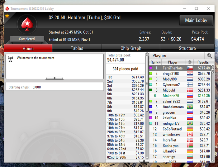 Вывел немного денег на подарки маме и другу на дни рождения. В итоге сейчас имею БР 1.900 у.е. Играть буду примерно те же турниры, поднимать лимиты сильно не планирую, так как всю жизнь играл на аби 2.5, и надо потихоньку прощупывать поляну, играя меньше столов и меньше дистанцию. Так как уменьшать дистанцию не хочу, буду играть те же лимиты, и подключать нокауты по 5 у.е и ХА турниры по 10.50, на выходных буду подгружать биг за 8, ди и вообще надо посмотреть что там не "лоу" лимитах вообще идет, особо и не знаю какие есть турниры там, еще не смотрел, но это только на выходных. Выше пока не буду забираться, вы уж простите но я всегда придерживаюсь очень консервативного БР менеджмента. Если будут советы, буду рад выслушать.