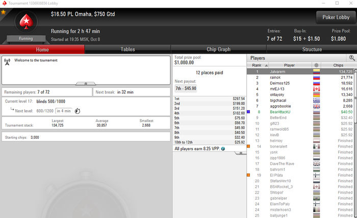 PokerStars - $30+$3|100/200 PL Hi - Omaha Hi - 9 playersHand converted by PokerTracker 4MP+1: 33.86 BB (VPIP: 20.00, PFR: 20.00, 3Bet Preflop: 25.00, Hands: 5)