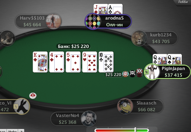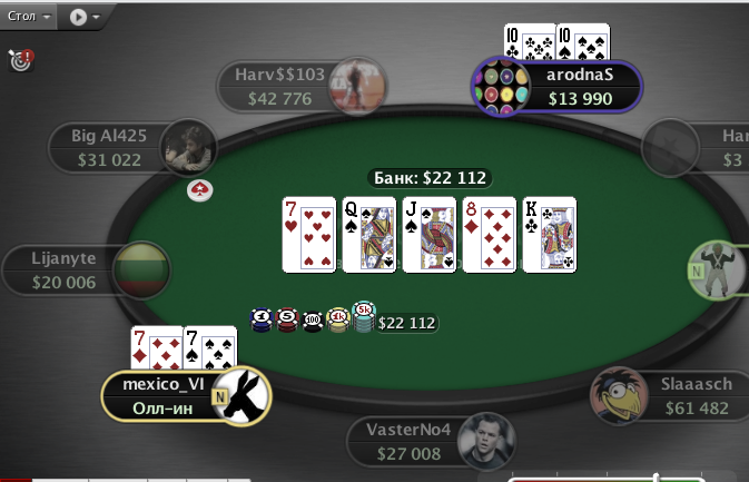 Жесть) В этом миникартанчике я хз что вообще происходит, но когда я сажусь за стол все фиши считают своим долгом сразу же вгрузить в меня весь свой стэк Пример вчера: ефф стэки1к первый хенд сдают на флопе и фиш отгружает в меня весь стек по ... делает ребай и через несколько хендов выставляет в меня 1.5к на мой рейз 150. я кол хули и мои > Сегодня: первый хенд открыл 50, фиш выставил стопку мелких в 195 грн я кол флоп я донк 300 он кол тёрн бланк я бет 600 он пуш 1200 и показал на шд ...