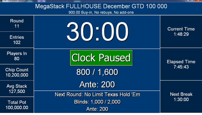 Всего поучаствовали 102 человека, из них в игре осталось 80 игроков. Средний стэк 127 500. По итогу дня на завтра, с учетом предварительной регистрации, осталось 20 мест. Турнир на 18.00, регистрация с 17.00