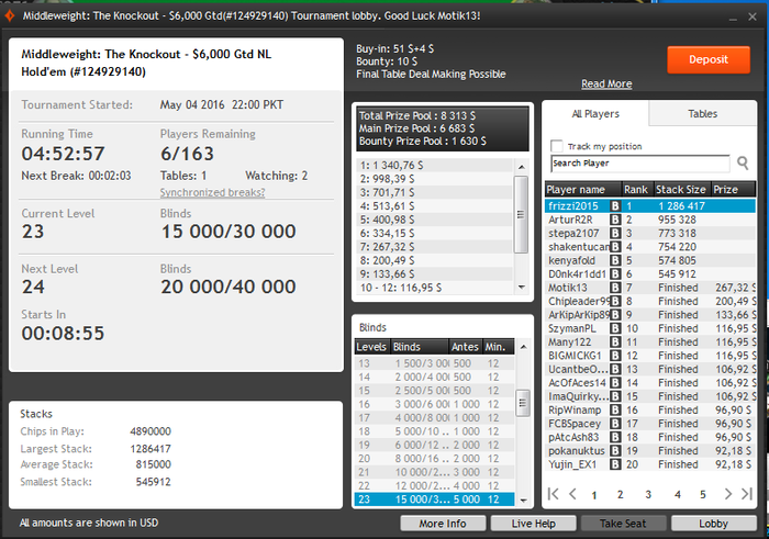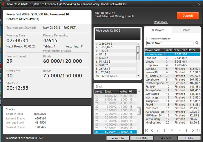 Blinds: 15/30 Ante 5