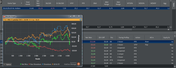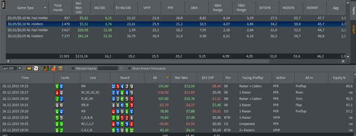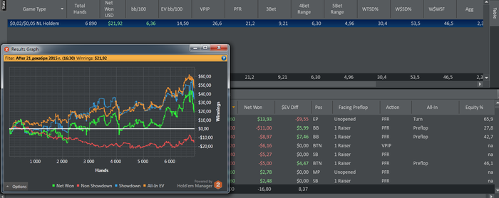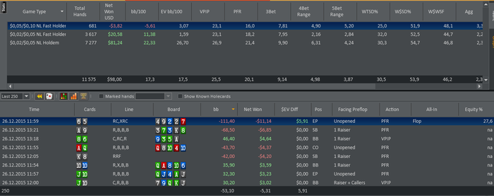 MP: $7.20 - VPIP: 28, PFR: 21, 3B: 7, AF: 2,0, Hands: 105