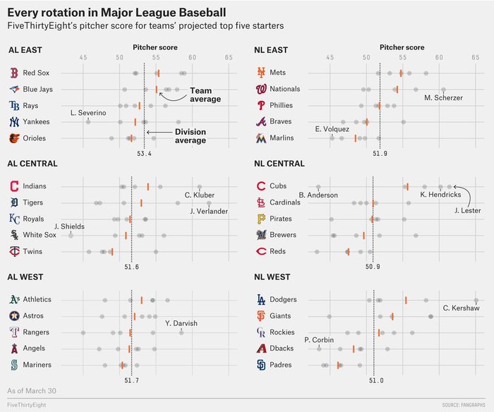 Интересная диаграмма с оценкой ротации питчеров всех команд по мнению "fivethirtyeight.com". Первым конечно Кершоу, дальше Верландер, Лестер, Клабер, Шерцер, Хендрикс. Оценка проводилась по показателям нахождения на горке, доминация (я так понимаю страйки) и количество пробежек.