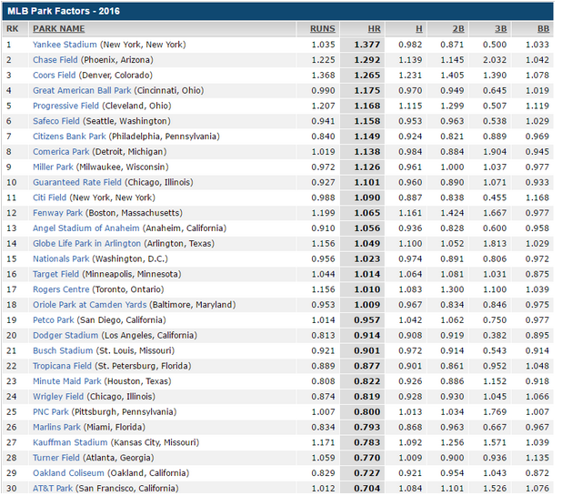 Общеизвестный факт, что результативность матча во многом зависит от того, на каком поле играют команды. В прошлом сезоне больше всего хоум-ранов было выбито на Янки стэдиуме, а меньше - в телефонной будке Сан-франциско.