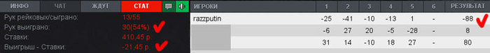 Насчёт процентов выигранных рук. Ниже убедительно доказано, что это всё-таки относительный показатель. Понятно, что желательно иметь его повыше, но, глядя только на него, нельзя сказать выйграл ты или проиграл. Можно выигрывать по 2 куша и проигрывать по 30. По цифрам (и не только) я вижу отсутствие карты у меня и присутствие оной в самых неожиданных местах.