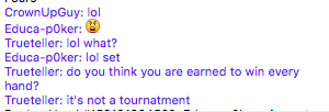Прибавить к этому супервылет в турике за 16,5 на баббле будучи почти чипаком, выставившись с одним человеком 3 раздачи подряд, будучи впереди на префлопе с 75%(все 3 раза у меня были сильные АА, а у него большая пара, иногда даже без лоу), и в итоге вылететь на бабле. Во время третьего оллина, когда ему доехало 2 пары на терне и ривере я уже немного истерично смеялся.И также 3-й день подряд вылет на бабле 55 турбо ночного, получим самого ВЕЗУЧЕГО ЧЕЛОВЕККА В МИРЕ. НО Я НЕ ПАНИКУЮ!!!Ведь я добрый персонаж, а они всегда побеждают