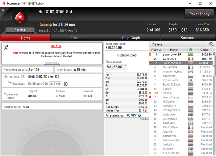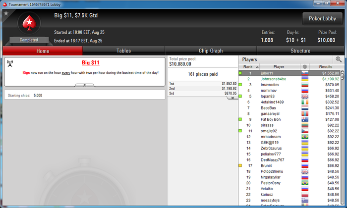 Таки доехал, стартовать сессию в 6 вечера и грузить последний турнир в 01:00 с 15 минутными уровнями таки окупилось. Заслуженно рекламирую лучшего в мире тренера Андрюшку AwadeuS'a, все благодаря ему, ну и выигранному флипу в 3 максе .