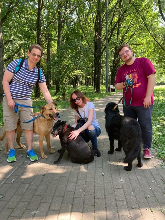 Приезжайте гулять с собаками! Это очень заряжает положительными эмоциями, когда собака в ожидании видит, как ты подходишь со шлейкой, потом начинаешь на нее ее надевать, у нее прям меняется поведение, появляется радость от того, что клетка на ближайшее время сменится на просторный парк. В этот раз мы успели погулять с 4-мя собаками, забавно, это получилось случайно, Тимофей гулял с Тимошей!