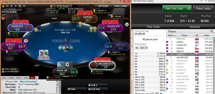 Pre Flop: (t36750) Hero is BB with callipopwnz calls t14000, 6 folds, Stevepoker26 calls t7000, Hero raises to t340423 all in, callipopwnz calls t326423, 1 fold