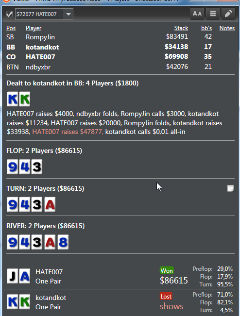 Помню эту раздачу. Это вроде околобабл точно. Когда увидел твой 3бет сперва вообще удивился. В такой стадии с таким стеком ты по идее должен играть фолд, кол, или прямой пуш. Получается у тебя либо КК+ либо какой-то мегатонкий мув. Ведь по идее(если я тебе верю и у тебя онли КК+) я должен тут рыть даже ДД и АК и в данном случае не важно АВ у меня или те же АК. Короче, череда уровней левелинга и я прихожу к выводу, что ты настолько крут, что способен тут исполнить)). Ну и немного математики. Все таки в банке уже немало фишек+ если я прав, что ты блефуешь, то имеется ФЕ+ эквити какое никакое у руки имеется в случае олина. Честно говоря, не учел я фактор фиша. Думаю, в рега ты и КК+ 3бетить не станешь, а сыграешь либо пуш либо кол. Ну как есть.