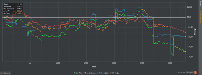 Start Bankroll 730,02$; Stop Banrkoll 668,42$; Cтолов 6; Мини сессий 6; Рук: 3349; Время = 360 мин; Результат = -61,08$ ; bb/100 = -14,81; Моя оценка = 0 с 10. Цель на день Net Won(22$) выполнена на -277,6%; Цель на день Hands (3400) выполнена на 98,5% Цель Руки на пятый игровой отрезок за все дни (333К) выполнена на 5,1% (17169 рук); Цель NW & RB на пятый игровой отрезок за все дни NW (2000$) выполнена на -4,87% (-97,59$), RB (200$) выполнена на 5% (10$); Comment: Не складывается, ошибки = печальный результат.