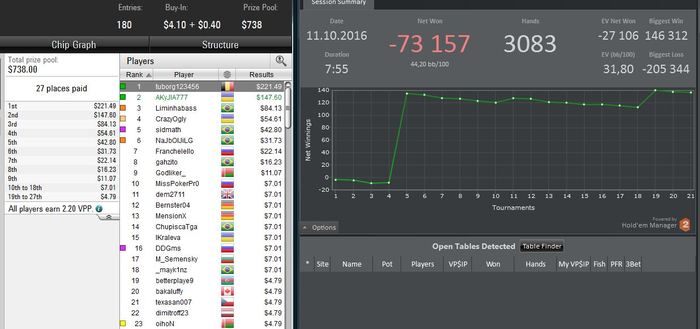 в итоге занял в одном мелком турнире на восьмёрках 4-е место +$47 и ещё на старзах в многих турах были хорошие стеки, но всего лишь одна финалка и конечно же в самом нищем турнире 6мах за 1 бакс ребайник 600 гарантия (перебили до $747). За финалкой хорошо себя чувствовал, оппоненты почти все слабые когда остался в троём два оппонента захотели делить, но я был против, т.к. стек хороший делить особо нечего и один оппонент был фишной, а второй средний рег. в итоге вынесли фиша. Когда остался в ХА у нас были прибл. одинаковые стеки где-то больше 70бб плюс мне позвонил батя надо было выйти на 5 минут... ну я предложил поделить, но пидар из голландии отказался. написал типа ХА это его профиль... в одной раздаче проколил 3 бареля по 2-й паре при том что на ривере образовался 3-флаш, так я отдал пол-стека (( ну и дальше надо было спешить закончить.. короче слил ХА. хоть и разница небольшая всего 40 баксов, но осадок остался неприятный. в итоге сессию отыграл в +$150