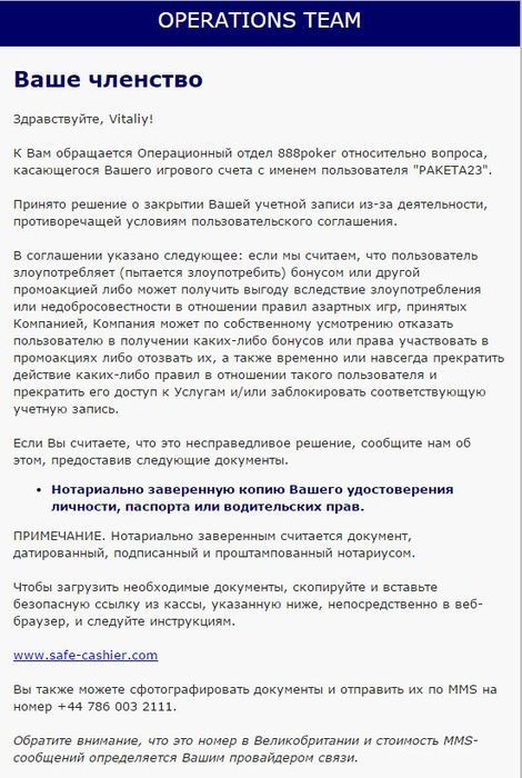теперь по порядку. в общем регился я на 888 хрен знает когда ещё от Стратеджи, но никогда там не играл и вот когда вступил в школу фритим пришлось знакомится с 888, хотя до этого периодически играл на лотосе. В начале тренер перевёл мне немного на игру, а потом я и сам решил сделать первый депозит. мне конечно же предложили бонус я согласился и автоматом принял их условия. перед депозитом отправил фото своего паспорта и в он-лайн чате несколько раз спросил больше ничего не надо ? т.к. было какое-то сообщение что счёт якобы не полностью активирован, ну меня уверили что всё ок можете играть. ну ок. сделал деп что-то в районе 80 баксов и начал играть.. всё норм. выкатывал себе понемногу, отыграл первый пакет от фритим перевёл тренеру бабки где-то 30-50 баксов, всё нормально. Потом играл дальше, взял 2-й пакет по фритим. Занёс турик на 400 с копейками на счету было 500 с лишним, потом начал потихоньку заливать (в общем это всё не столь важно) и тут мне на счёт капает первая частичка бонуса от 1-го депозита $10 и я решаю что 10 баксов чисто мои и не относятся к фондовскому пакету от фритим, решаю заказать 10-ку на выплату (первый кешаут с этого счёта) ну что бы эти 10 баксов не путались на счету и я не держал их в уме при заполнении пакета. ну и вот через день приходит это письмо а на счету $416 и на выплату заказано $10 а вечером приходит ещё одно подобное письмо только уже от лотоса в котором я на днях выктал почти 300 баксов (скрин выше) и в связи с переходом лотоса в другую сеть заказал все бабки ($300) на выплату. В общем после этих писем конкретно обос***ся, ведь под угрозой оказалась большая часть БР ($700+) раньше кстати были уже баны на других румах, но об этом напишу чуть позже. Честно говоря бредовый бан получился я так и не понял какого хрена, типа они посчитали что я вывожу 10 бонусных баксов, которые я честно отыграл. играл только мтт и никаким специальным отмывом не занимался. В общем написал им письмо что не понимаю по какой причине бан и отправил им фото своего лица рядом с паспортом, сам паспорт и права. на что получил ответ что это всё не то, давай копию паспорта заверенную у нотариуса. Ну ок. Пошёл к нотариусу.. говорю мол так и так.. а она мне какого х**... у нас в стране запрещено законом заверять копию документов удостоверяющих личность. Сказала что я не заверю, т.к. это противозаконно. Пошёл к другому, он мне туже песню. Ну и бред получается... Позвонил брату узнать есть ли знакомые нотариусы, он сказал есть, но сразу выйти на связь не удалось. пришёл домой сел катать мтт на старзах и тут пришло письмо от скрилл. Деньги получены $300. Это пришли заказанные 300 баксов на выплату с лотоса. уже хорошо, настроения начало подниматься. Играл хорошо, даже отлично и кое что выкатал, заносик будет в след. посте. А ещё сегодня утром позвонил брат сказал что заверят мне копию в понедельник. Надеюсь что всё решиться.