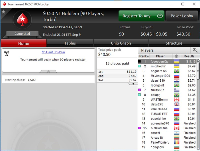Затяжная футбольная одиссея продолжается, поэтому я практически не играю в покер, сильно устаю и ничего не пишу в блог. Но пару дней назад, я решил отыграть сессию на полтинниках. Не смотря на то, что там с самого начала были такие подставы которые и в страшном сне не увидишь, сессию чудом удалось вывести в плюс вот этим турниром: