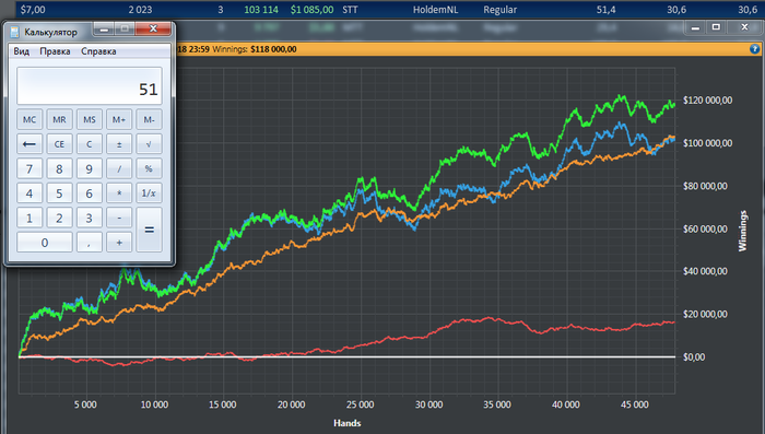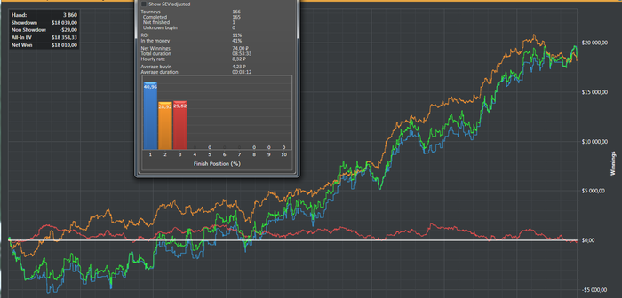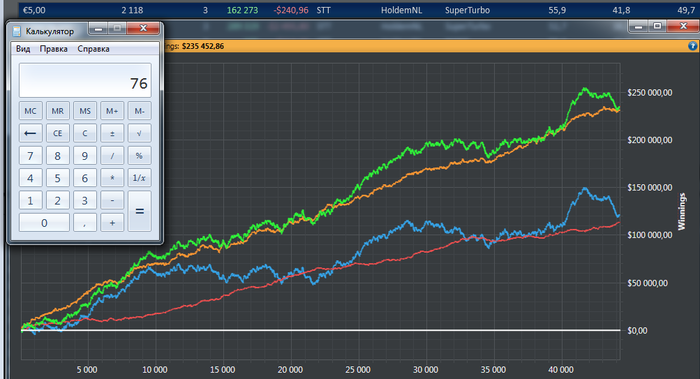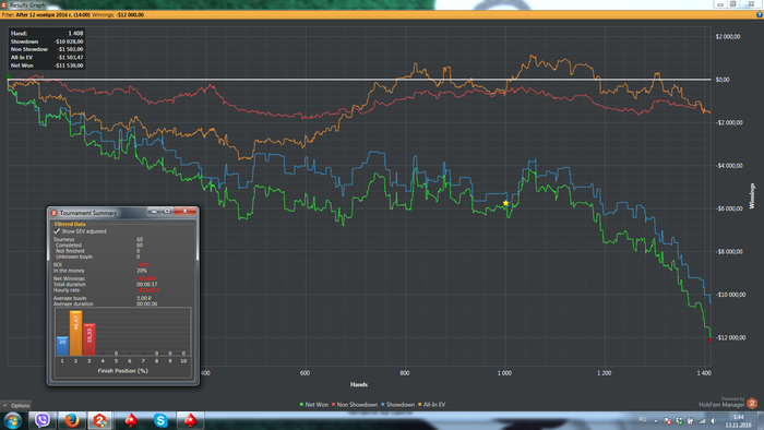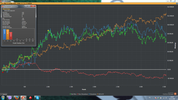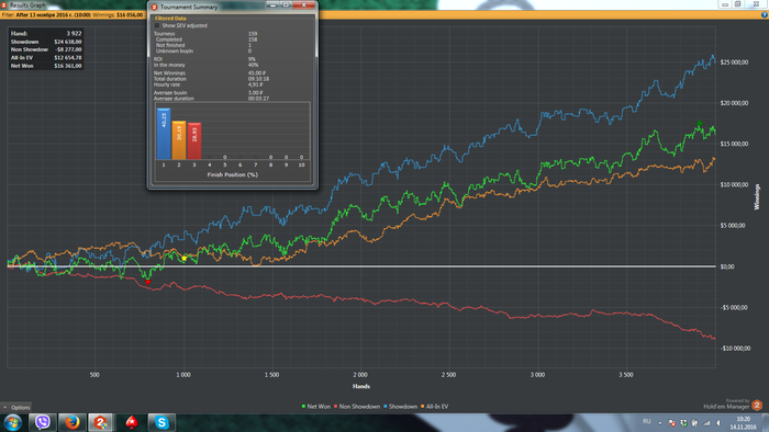 Оставшуюся часть отпуска я посвятил плотной катке, теории и психологическим аспектам. В дистанции проблем не было, я отыграл в два стола 900 турниров за 70 часов игры за 10 дней. По второму вопросы сбоев тоже не было, хотя было не легко. Ежедневно проводили просмотр моей игры, разбор раздач, анализ графиков, устранение ликов. С психологическими аспектами все намного сложнее. Хотелось все бросить раза три наверное. Потом опять внутренние голос:"Почему они могут, а я нет. Чем я хуже?". Доходило до "сеансов терапии" с моей женой, где мы разбирали мои внутренние страхи и переживания. Жена сказала интересную вещь, я даже не придал этому значения: "С дисциплиной и мотиваций у тебя проблем точно нет. Ты перестал пить, не куришь уже больше года, стал снова спортом заниматься, в телек вообще не залипаешь, спишь по 4-5 часов в сутки и садишься за комп. Может тебе не хватает знаний". Мне всегда казалось, что вся проблема в психологии. Это заблуждение, нельзя рассматривать изолированно один из органов общего организма. Все системы взаимодействуют. Сейчас я это вижу как будто мне сняли повязку с глаз. Я провел анализ своего жизненного пути, своих личных достижений, не скажу что я тертый калач, но точно не слабак. 8 лет спорта, в 16 лет получил права, 2 высших образования, четыре смены мест жилья из области в область, депутатство, руководящие должности с 90 людьми в подчинении, общение и нахождение точек соприкосновения с разношерстной публикой от успешного бизнесмена до асоциальной потерянной личности. А может это вовсе и не психология, а просто закалка. ХЗ. Это надо отдельный блог заводить....к этому я еще не готов.