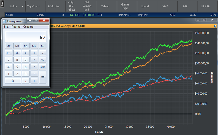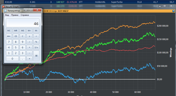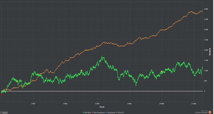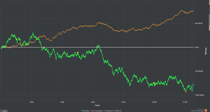 Просто хотел сказать, что Winamax на всех выставлениях на префлопе разъеб...ет меня по полной. Должно быть по профиту 2к, а по факту -3к. Вот тебе цифры для большей информативности графика.