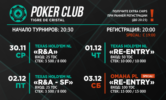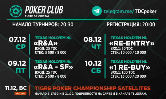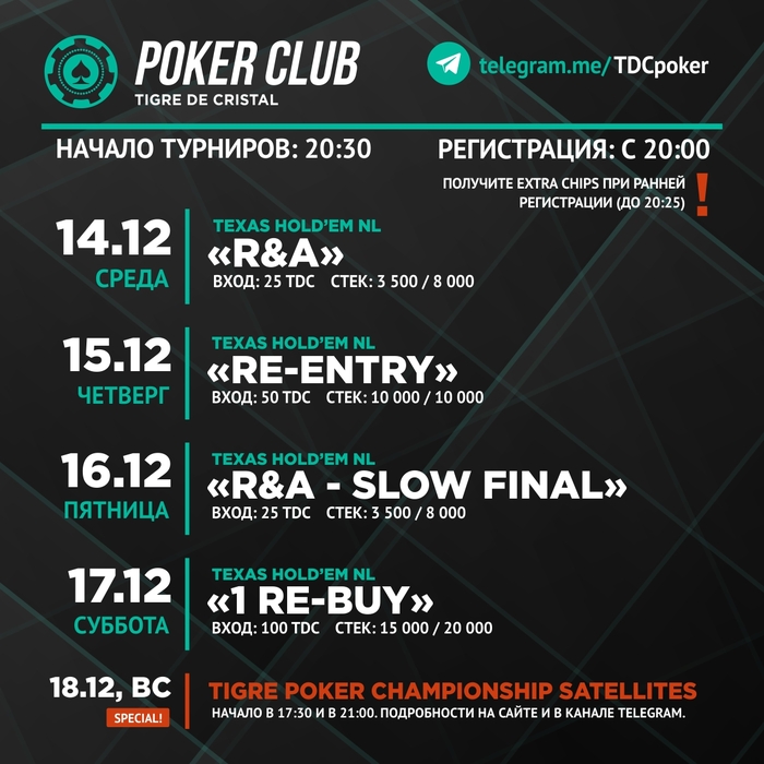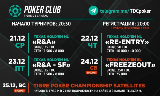 Дорогие Друзья! Публикуем расписание Покерного клуба на эту неделю. На этой неделе Вы не найдёте каких-то неожиданных изменений в нашем расписании: только проверенные классические турниры нашего клуба. Так что, если Вы хотели посетить один из турниров на прошлой неделе, но по каким то причинам Вам это не удалось, сейчас самое время исправить ситуацию! Также напоминаем о январской серии "Tigre Poker Championship" с общей гарантией более 1.500.000 рублей. В это воскресенье, 18 декабря, в турнирах Satellite будут разыграны билеты на Grand Event и Main Event.