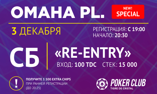 Суббота - турнир OMAHA PL "Re-entry" по 100 tdc. Регистрация с 19:00 Турнир проходит в формате Re-entry. Buy-in 100 tdc, стек 15 000 фишек. Re-Entry 100 tdc, стек 15 000 фишек, возможен только при нулевом стеке. Extra chips - 1 500 фишек. Уровни по 25 минут. Период Re-Entry и поздней регистрации первые 8 уровней. Формат турнира - Omaha 4 cards Pot Limit (8-max).