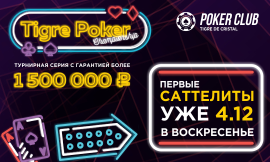 Дорогие Друзья! Рады Вам сообщить, что уже в это воскресенье 4 декабря, пройдут первые отборочные турниры "Satellite" к покерному мероприятию "Tigre Poker Championship" с общей гарантией более 1.500.000 рублей, который состоится с 6-8 января 2017. Satellite - это квалификационный турнир с небольшим стартовым взносом, в котором разыгрывается не денежный приз, а путевки на более крупные турниры с более крупными стартовыми взносами. Ждём всех желающих! Под. +7-914-682-86-43 (Алексей)