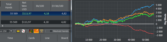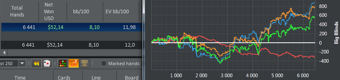 Да уж, стабильности в моей игре очень мало, как и мастерства, судя с игры в ноль на пол дистанции и заваливания красной линии с нуля в -6бб/100 за другую половину дистанции Как и писал раньше - нет стратегии, не проработан, так скажем, костяк на котором бы строилась моя игра. Постоянно меняю игру в зависимости от настроения,уверенности, выигранных, проигранных, денег и тп и тд.