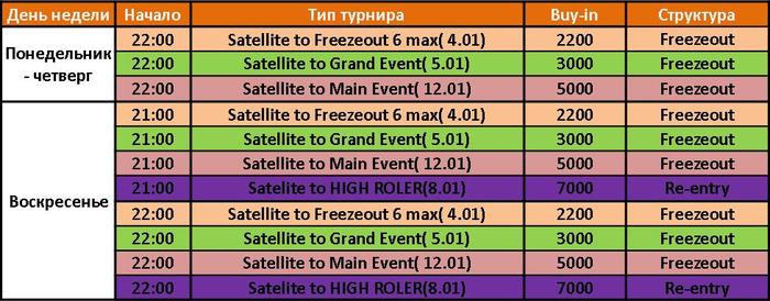 Buy-in 11 000, chips 20 000 8 уровней поздняя регистрация по 30 минут Гарантированный призовой фонд 500 000 рублей (без учета Bounty)