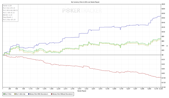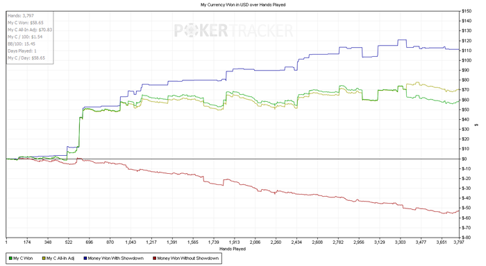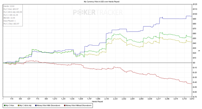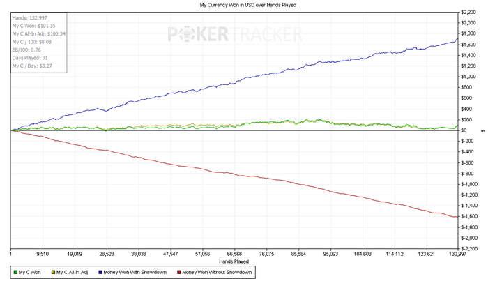 Играл NL10, фулл-ринг, в основном регулярные столы. Результаты печальные. За 133 тыс. рук профит получился всего 100 баксов (и "реально" и по EV) Винрейт, если его можно так назвать, получился меньше еденицы: 0.75BB/100. Но я вижу некоторые слабые места в игре, буду работать над ними.