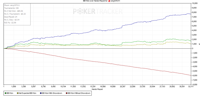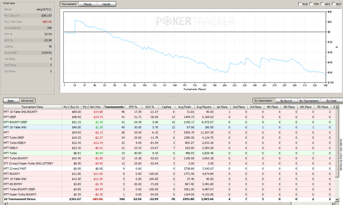 Турниры Всё время меня тянет к МТТ, хотя там я показываю стабильный минусовой результат. Сыграл фоном к кешу 340 турниров на общую сумму $362, ROI=-23%