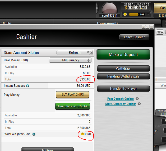 Кеш: +$101 Турниры: -$85 Кешбек (старзкоинами): примерно +$120 В акциях: примерно +$25 в челенджах + $10 за депозит Депозит: $50 - для получения бонуса Кешауты: $150