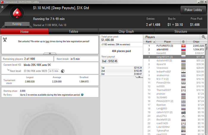 Первые 4 дня февраля прошли нормально. Всё так же показываю стабильно низкий винрейт на NL10, но теперь просматриваю вчерашние раздачи перед сессией. В турнирах последние два дня получаются хорошие дипраны. Самый глубокий был вчера, в субботу - 17-ое место в Deep Stack за $2.2
