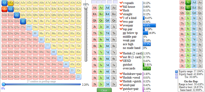 В картинке выше я заложил ему диап 3 бета исходя из того, что это пребабл и ты открываешься с УТГ, на Вас обоих уже давят призовые, и как правило спектры сужаются. 1) Случай у тебя почти коин с твоей рукой против диапа, а вот во втором ты увы позади и там нет пуша, только колл и розыгрыш по флопу.