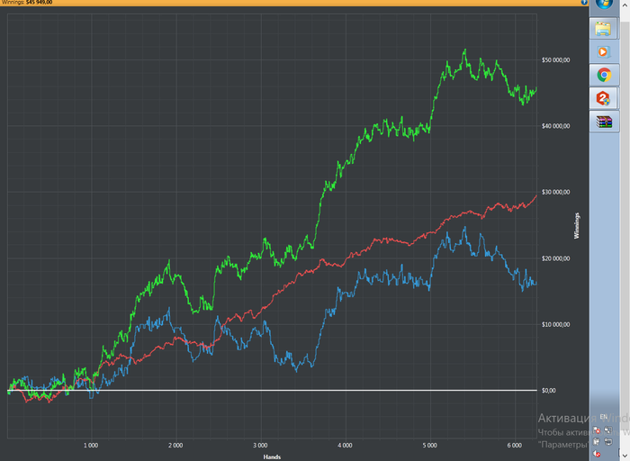 Христос Воскрес, пасаны. Вот забавная штука, есть на форуме хоть один товарищ, который всерьез постился?) Наверное нет, потому как процент могущих в критическое мышление здесь явно больше чем множестве других мест. Вообще, отношение к религии у меня всегда было одинаковым, но все же на ночную службу сходил, просто, как дань традиции, дабы не расстраивать близких, для которых это важно, да и просто, почему бы нет? Надо сказать, что когда видишь эти трогательные улыбки на сморщенных от старости лицах бабушек и дедушек, для которых, может, единственная радость и счастье в жизни остались в словах "Христос воскресе" от священника на паперти, то готов простить религии очень многое. По поводу покера. Откатал каких-то жалких 100 турниров за неделю, при этом уходя периодически в запойный "автопилот" и не получая удовольствие от игры. Вообще, понял одну вещь - просто, как ни старайся, не могу катать больше 1-ого стола хедзапа. Начинаются какие-то помоечные хиро-колы, понимание игры летит к ебеням и хочется только одного - быстрее откатать сколько там я запланировал турниров за сессию и закрыть столы нахуй. Также и мотивация ввиде игры на объем тоже ни к чему хорошему не приводит, уровень игры становится ниже среднего. Ну я же фиш ебаный, чему удивляться?) Короче. Пока плюсанул на 150$. Это все-таки уже 15 би на 10-ый лимит, и шанс, что меня там обнулят уже не 100%, а 99. Так что цель теперь такая - выиграть 30 би на 10-ом лимите, играя только один стол, также периодически залетать, если вижу прям отбитых фишей, в кэш омаху нл10 и херачить там всех аки бельмондо. Поехали ник, если кому надо(лол) - pastor272, 888. Ну вы поняли к кому подсаживаться на 10-тках) ps вот кстати поехавший график с 5-ого лимита
