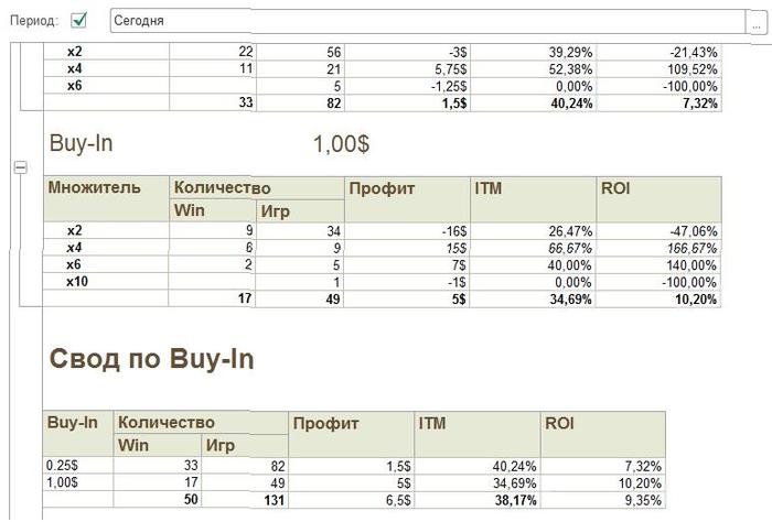 Я решил играть с условием 100BI 3$ на 1$ для перехода на 3$. За 1,5k 0.25-1$ (1100 на 1$) туриков - 54% completed (x25 был только 1 раз на 1$). Судя по текущим параметрам ожидания ITM - это еще где то 1,5k туриков на 1$.