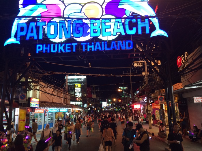 Съездили один раз на Патонг, это самая оживленная часть острова. Пляж конечно там отвратительный, грязный, куча людей вода мутная, но там прикол не в этом. На каждом шагу бары, кафешки, музыка. Ну а самое главное - Бангла роад, тусовочная улица, куда вечером идут все, кто хочет лицезреть сиськи, письки, члены, трансов и проституток. В общем, больше чем один раз я бы на это не смотрел, но посмотреть стоит ))) Фоткать все это запрещено под страхом огромного штрафа, поэтому здесь будет обычное фото Бангла роад ))