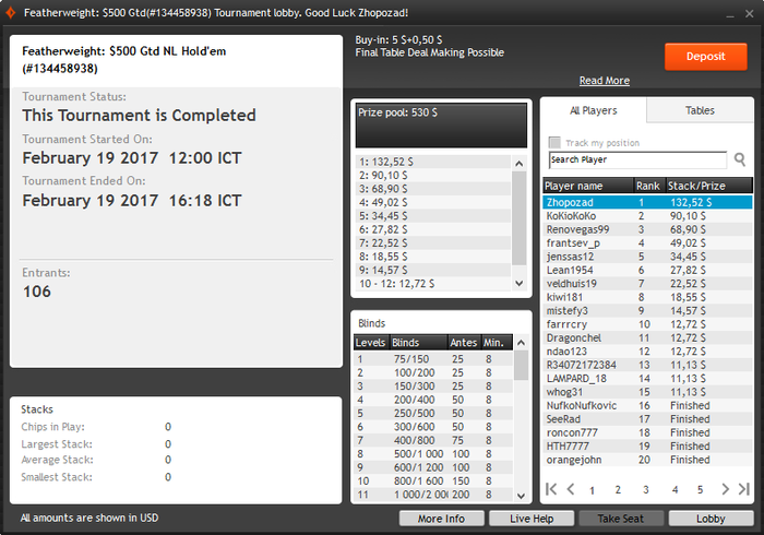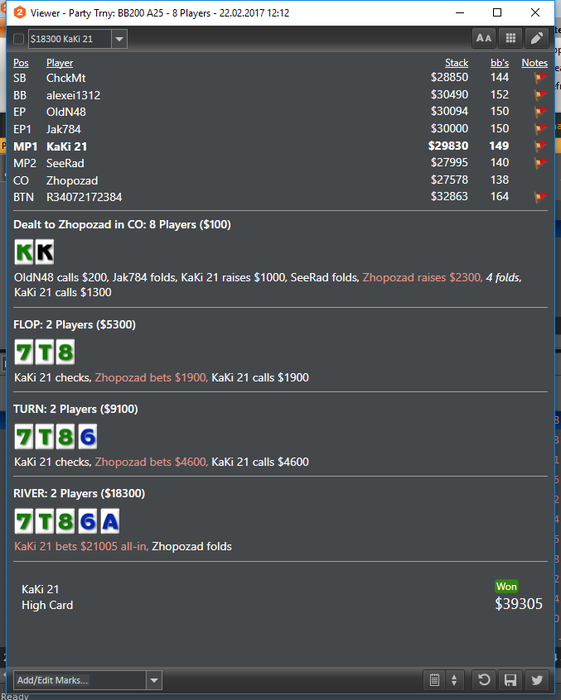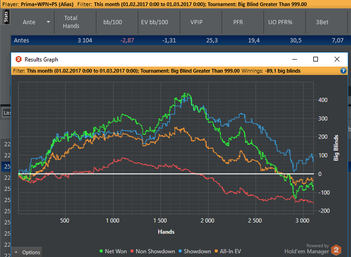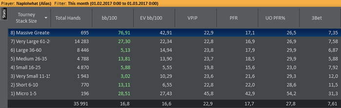 В этом месяце добавил в загрузку покерстарз, вообще до этого был не сторонник игры там, но втащенная бигуля резко поменяла мое мнение Также, пытался добавить WPN, сыграл там около 50 туриков с рои -95%, забил на это дело. По ощущениям, игра там сильно отличается, поле забито нитовыми фишами, нужно подстраиваться, а сделать это трудно, когда катаешь еще 4 рума, поэтому ну его. Еще, немалую часть загрузки составляют баунти билдеры, но что-то я пока не нашел себя там, по 12 фишей за столом, рейзы колят минимум 5 человек, а еще пихают донк пушами флоп и терн в 3 банка натсовые флеши, стриты и тд, естественно не справляюсь с фолдами по топ-парам, нокаутик же, короч, надо разбираться Аби вышел немного ниже, чем было до этого, опять же потому что покерстарз, думаю что килополяны в загрузке не должны быть самыми дорогими, и потому что покеркинг, пытался закрепиться, поэтому играл там самое дно.