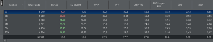 В целом, винрейтами недоволен, дикий провал на SB, CO, BTN, ну хоть ББ защищаю, аки Боженька )) Не нравится слишком узкий трибет, надо добавлять за счет поздних позиций, наверно и винрейты поэтому и просели.