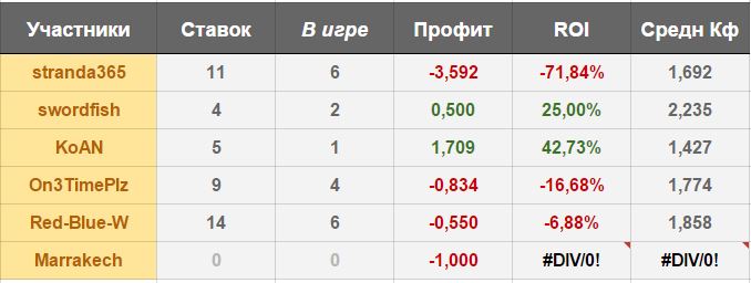 вот так получилось. норм? * у Marrakech профит -1.000 чтобы формулу не переписывать. как только пройдет хотя бы 1 матч, все станет норм. ** все цифры посчитаны на текущий момент времени, можно от них отталкиваться.