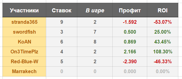 я знаю, но не хочу нагружать формулы ради очень редких или некритичных случаев. я люблю попроще сейчас ошибку выдает деление на 0, т.к. ставок у Марракеша ровно 0. хотя исправлю. специально для перфекционистов типа Сергея, чтобы в следующих туриках ничего не мозолило глаза)