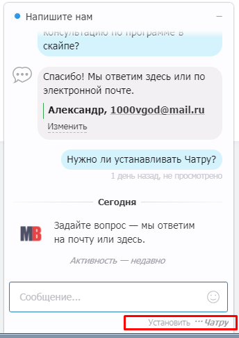 Вторник, 29 августа 2017, 15:37 +03:00 от Юля из Чатры <ru.support@chatra.io>: Здравствуйте! Недавно вы зарегистрировались в Чатре, но я обратила внимание, что мы пока не принимали чатов с вашего сайта. Скажите, пожалуйста, не возникло ли каких-нибудь сложностей с установкой? Мы работаем над тем, чтобы сделать установку максимально простой, и я бы хотела лично помочь вам во всем разобраться. У нас также есть короткое и понятное руководство по тому, как установить и использовать Чатру с максимальной пользой, пожалуйста, посмотрите — chatra.io/ru/help. Ну а если вы просто собираетесь начать пользоваться чатом немного позже, то мы с радостью подарим вам новый пробный период тогда, когда вам это будет удобно. Если дело вовсе не в этом, а Чатра, к сожалению, вас просто разочаровала, напишите мне об этом, пожалуйста. Нам очень важно делать продукт, который действительно будет полезным. Пишите, Юля и команда Чатры Roger Wilco LLC, 2200 Clarendon Blvd., Suite 1400A, Arlington, VA 22201 Если вы не хотите получать такие письма от нас, просто отпишитесь