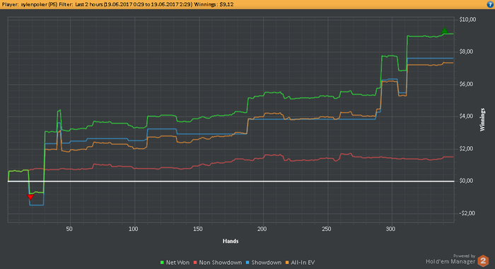 Решил переработать префлоп, стало лень взял из Джанды. Поиграю пога 4 стола по его чартам, до полного понимания. Дистанция накатывается тихо, но раздают хорошо. Резултаты сегодня: 348 рук 131 бб/100 +9.12