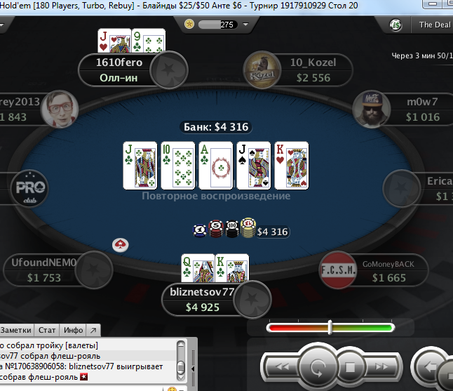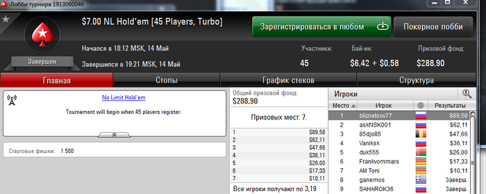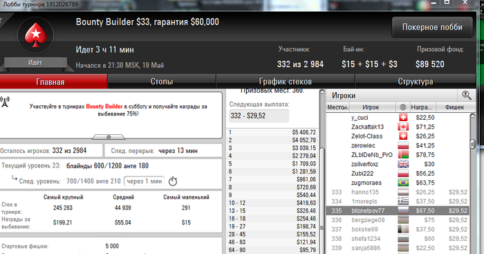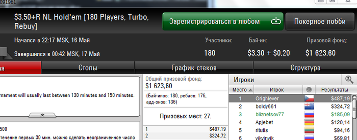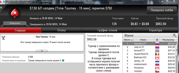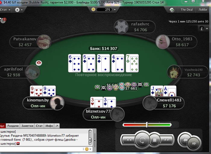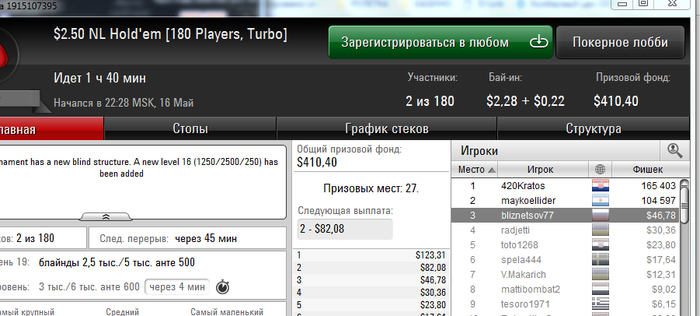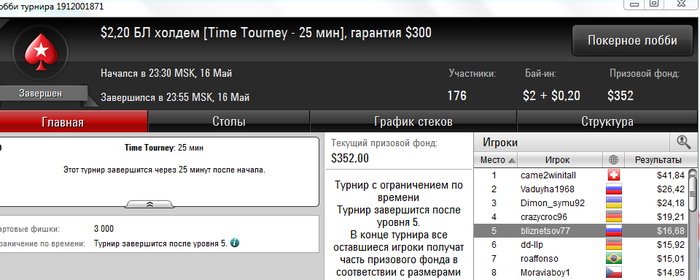 И снова здрасти. Несмотря на ряд заносиков в воскресенье банкрол просел на сотню. И все из-за того, что руки чешутся поиграть более дорогие турниры. В принципе я допускаю играть при банкроле от 150+ в единичных случаях ( ключевое слово единичных) что-то за 11$ на выстрел, кроме баунти. Так как его за 11 и за 16,5 успешно катаю (и подчистую подымаюсь с них) при банкроле в 50 баксов. Но в данном случае, помимо баунти 11 и 16,5;11- 4 мах сыграно (то что не нужно было катать) : 16,5 гипер, 16,5 сателлит 165hot, 11 гипер, 11 hot, 11 зум и еще какой-то за 11 и еще много наделал ребаев в 3,5 180 чел, ну где-то на 20-30 баксов сверх разумных пределов. Вот она и вырисовывается соточка просадки. Ну и в понедельник, видно или словил даунстрик, либо затильтовал. Но той катки уже не было. итог еще минус 150. Да и сейчас открыл один на 7,5 и с первой же раздачи вылетел. В общем задница. на счете осталось 91$. Будем думать, что делать дальше.