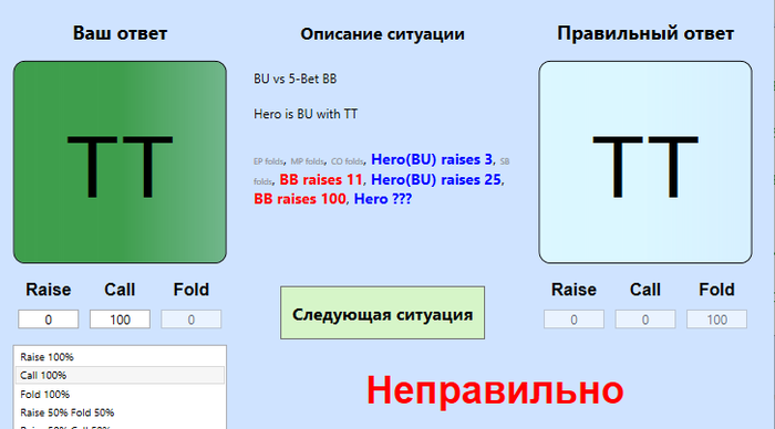 DixiOmnes, Программа самолет,сам функционал мне очень понравился. Просто против диапазона пуша заданного в 3.3 кол после 4бета лучше фолда чисто по математике. Был интерес почему она категорично сказала, что это фолд. Может я в чем то не прав, буду рад если меня поправят. В любом случае спасибо за труд.