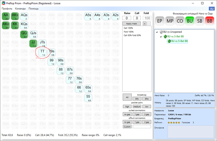 1) Диапазон действия оппа не задается напрямую,но его можно описать "на словах" в названии слоя реакции. Например, "BU vs 5-bet BB (4%)". Как следствие - Призма не рассчитывает EV той или иной руки против действий оппа, но зато рассчитывает какой % диапазона необходимо защищать, чтобы не быть оверфолдером.