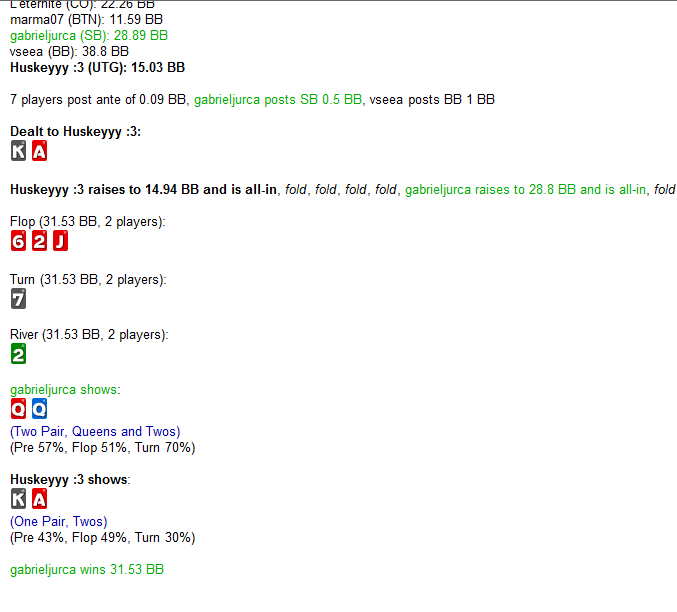 Единственные возможности где мог плюсануть не увенчались успехом. Везде проиграл коины или будучи сверху. 2/3 проиграл ривером.