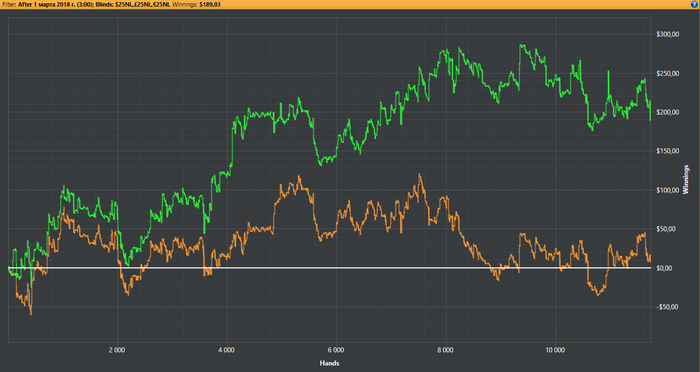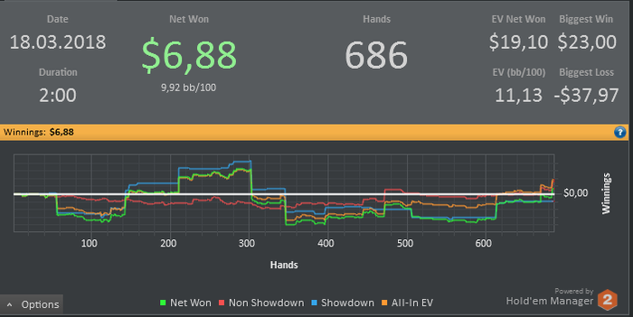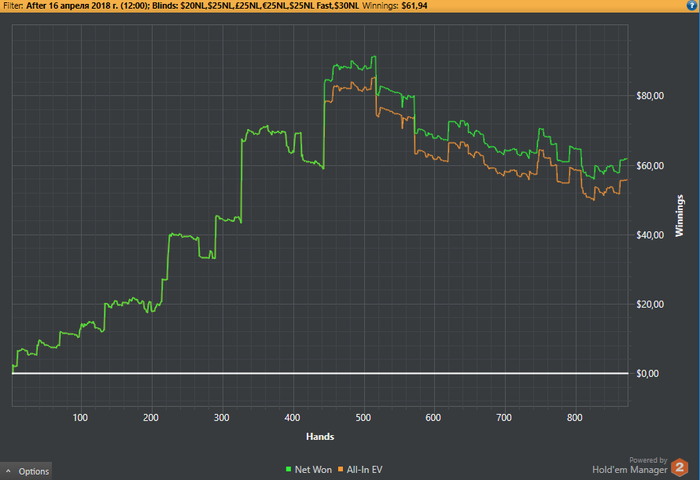 МартПо результату сравним с январем ~ 150$ профита. Игра, наверно, более менее выравнивается, но все равно смотря на свои статы мне становиться грустно и хочется плакать. Рад, что совершаю ошибки, они дают понять где у меня проблемы, ведь лучше на нл25 заниматься творчеством, хоть и самым глупейшим, чем на нл100+, где цена ошибки будет в в разы выше.