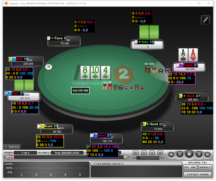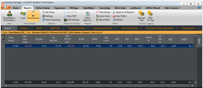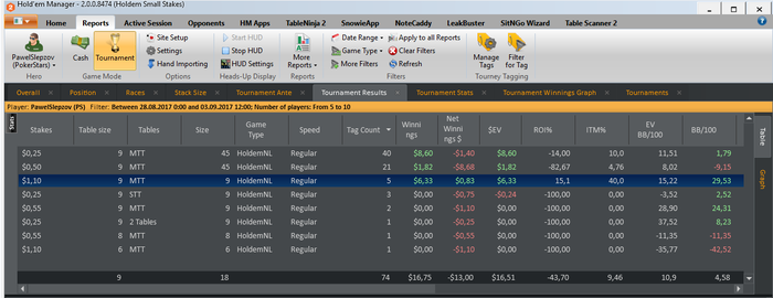 Что касаемо работы над игрой, одна из моих задач это повысить VPIP к отметке 20. За эту неделю сдвинулся с отметки 15 до 17.8. Что мне уже немного радует. Но еще много над чем надо работать, есть ошибки в постфлоп игре, в основном на ривере, иногда с меня явно добирают, но я все равно делаю кол. Стараюсь выявлять и сразу записывать над чем мне нужно поработать.