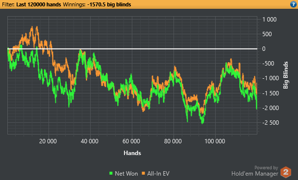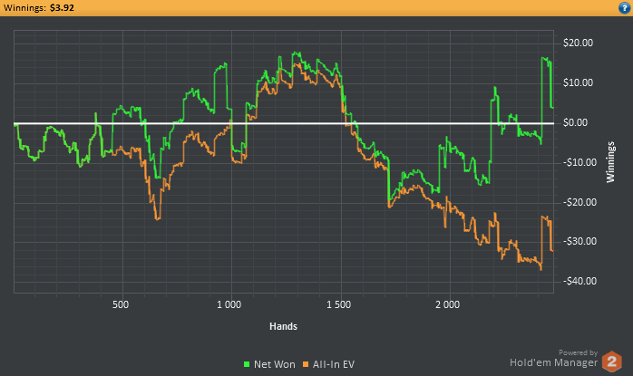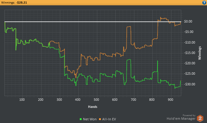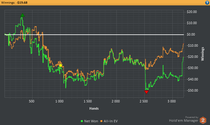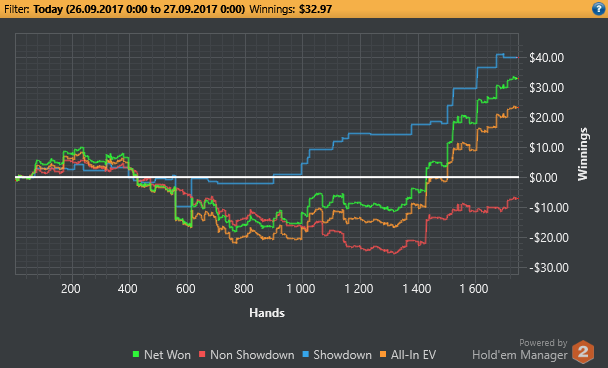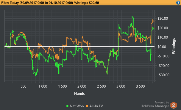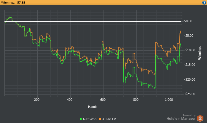 Самое главное то, что я в правильном направлении это была плохая идея поставить цель на дистанцию... Ведь у меня только пол дня есть на сессии, а 3к рук это 6 часов минимум... блин в таком состоянии так долго сидеть сконцентрированным для меня пока что нереально. Поэтому надо будет сократить количество играемых рук в день. Ведь надо будет еще и потренироваться успеть. В общем сегодня ошибочных решений конечно же очень много принял :( Тильта не было, т.к развитие идет в правильном направлении. Главное каждый день тренироваться.